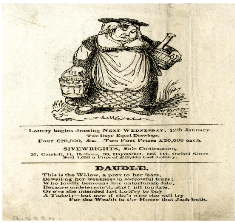 This lottery advert uses the popular character of Widow Brompton from Steele’s Grief-a-la-mode (1701). It can be seen how this advert was both aimed at widows, but also satirised the act with the soliloquy from Widow Brompton.