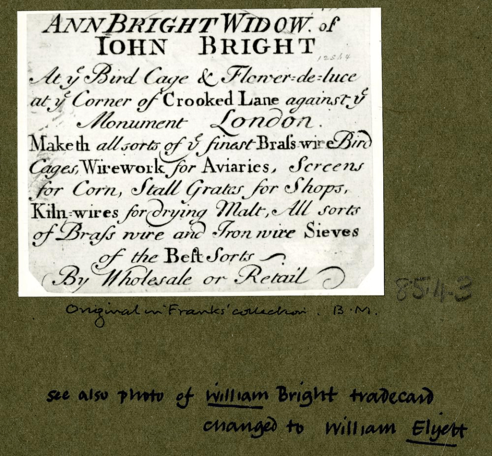 Anonymous (1760). Tradecard of Anne Bright, Widow of John Bright. [Online]. The British Museum. Available at: https://www.britishmuseum.org/collection/object/P_Heal-85-43. [Accessed 18 December 2023].
