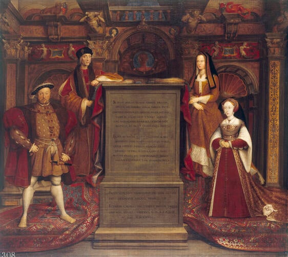 van Leemput, Remigius, Hans Holbein the Younger (original). The Whitehall Mural. 1667. Oil on canvas, 88.9 x 99.2 cm. Kensington Palace, London. https://www.rct.uk/collection/405750/henry-vii-elizabeth-of-york-henry-viii-and-jane-seymour.