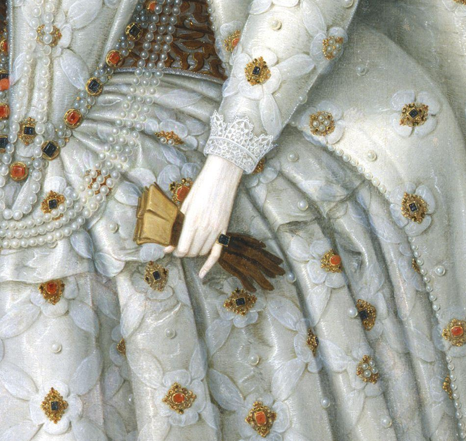 She is often depicted as holding a glove as opposed to wearing them, such as in Marcus Gheeraerts the Elder’s The Ditchley Portrait (Fig 11) and The Wanstead Portrait. Elizabeth’s real gloves accentuated her fingers’ extreme length, with stitching and padded fingertips elongating them even further.