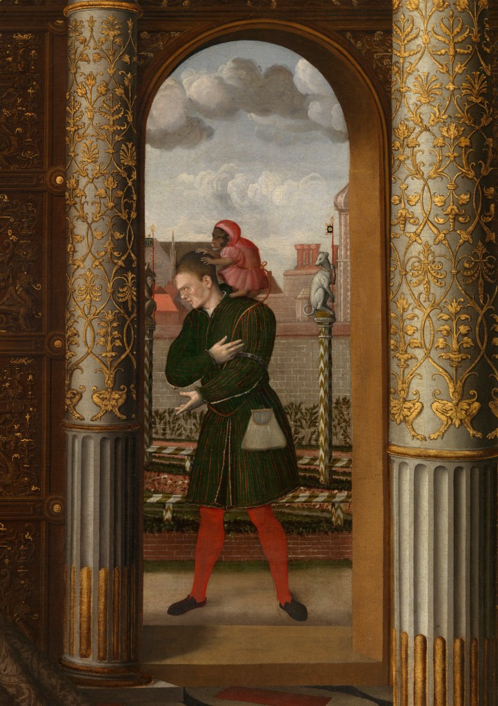 On the left of the portrait we see a new face, which is very easy to miss. He appears from the chest up within a small arch situated in Catholic Rome. It is unknown who this person is, however many theorise that it is the Tudor family fool, Will Somers. Somers had appeared in many Tudor family paintings previously, prominently in The Family of Henry VIII, which features the fool within a similar archway. His inclusion suggests that he was well-loved by the Tudors, having entertained during the reigns of Henry, Edward, Mary and been present at the coronation of Elizabeth. He could even have been regarded as a member of the family.