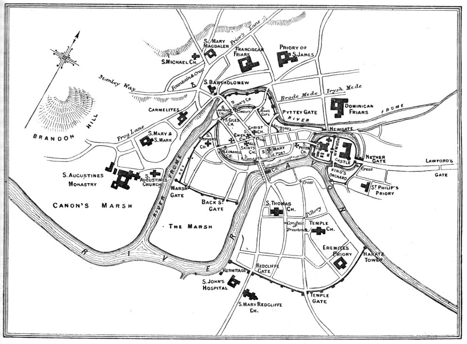 Nicholls, J.F., and Taylor, John. “Map of Bristol in the 13th Century.” Wikimedia Commons.