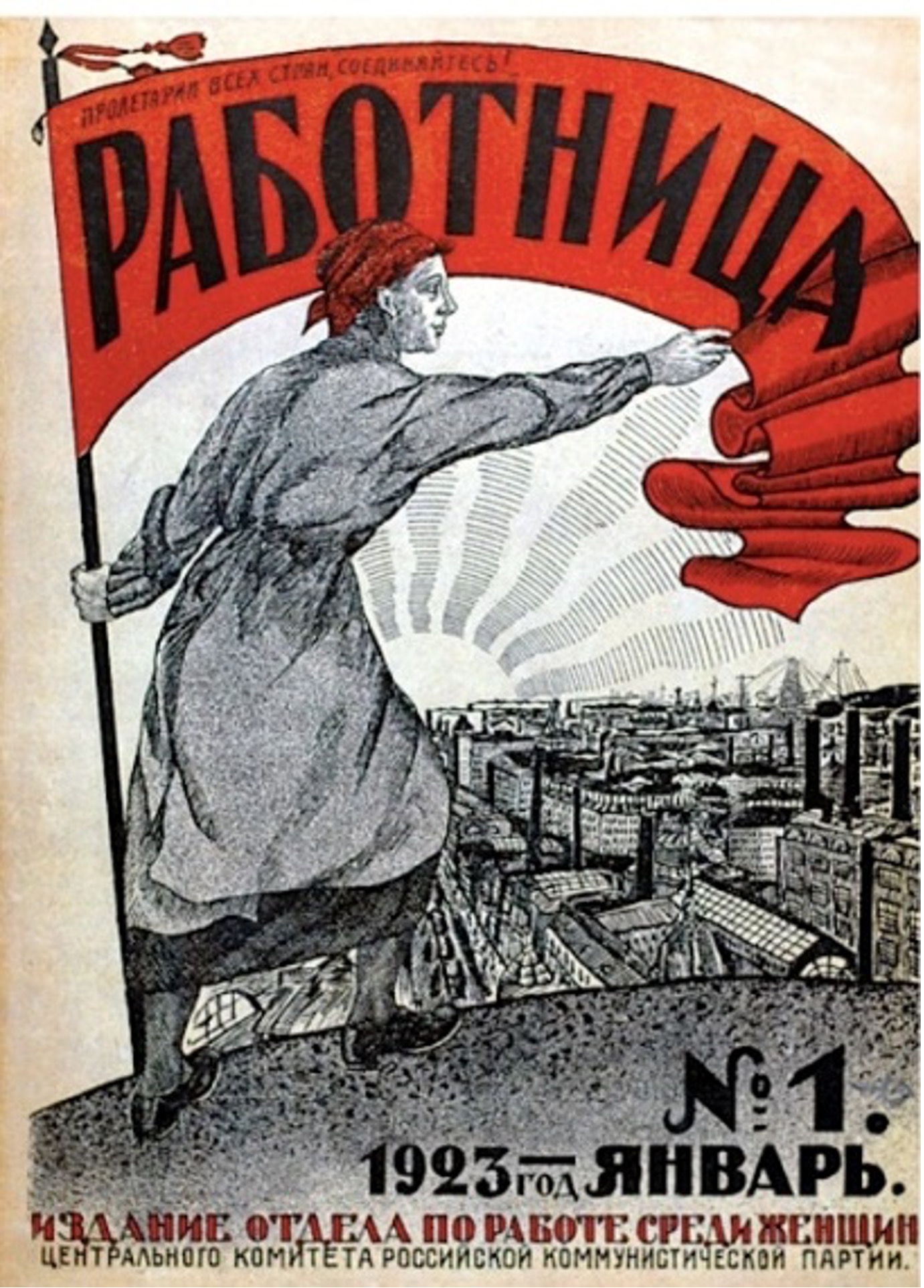 Figure 1 is the 1923 cover of a female-organised magazine titled Rabotnitsa (The Woman Worker), of which Lenin was a supporter. The paper was instrumental in promoting socialist ideas among women, aimed at female workers. On this cover, the title is displayed in a red flag, highlighting international socialism. The flag points to industry in the background, reinforcing and symbolising how women could make advancements into the workplace. Russian historian Anne Bobroff emphasises how the Rabotnitsa was the Bolsheviks’ first commitment to an official long-term contract with women. However, this was undermined by the dedication to focus on ‘women’s issues’, like maternity benefits, childcare and other domestic issues. Women were encouraged to participate within the state taking on leading roles to help build communism, but in reality, only a small minority were actually able to hold office; women of the working and peasant classes were less likely to serve as they lacked education. Therefore, women’s political consciousness evolved, but the ethos of Bolshevism remained strongly masculine.